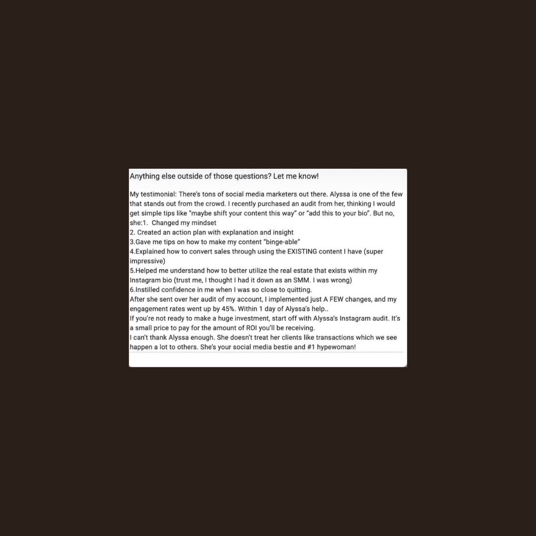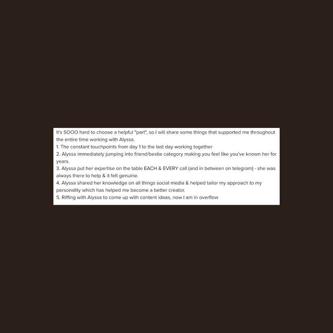 Coaching is for creators, founders, and service providers who are ready to take social media seriously but want an extra strategist brain in their back pocket. It’s perfect if you want long-term clarity, accountability, and strategy to guide your execution, not just posting to post, but posting with purpose.